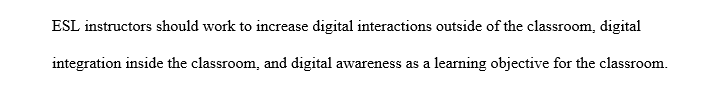 ESL instructors should try to increase digital interactions between students outside of class, use digital technology inside of class, and make digital avenues of education a learning priority.